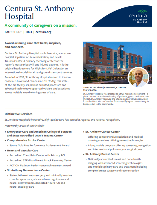 St. Anthony Hospital is a full-service, acute care hospital, inpatient acute rehabilitation and Level I Trauma Center. A primary receiving center for the region’s most seriously ill and injured patients, it is the original headquarters for Flight For Life Colorado, an international model for air and ground transport services.